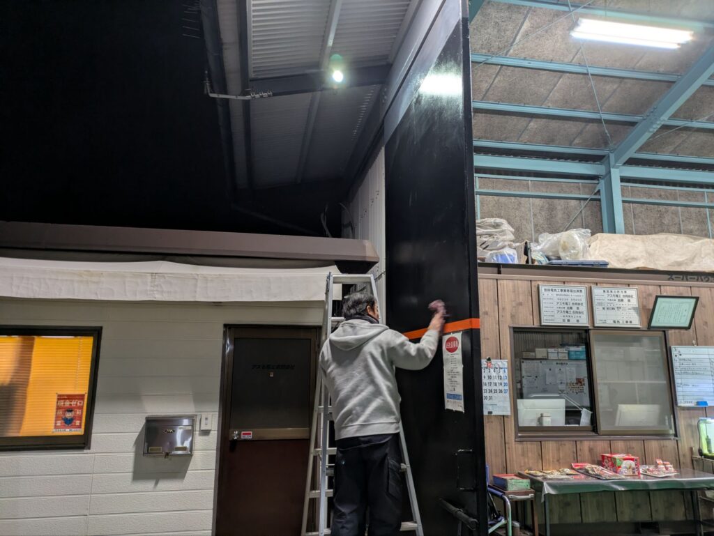 倉庫入口の大扉も、濡れタオルでキレイに拭き上げます。