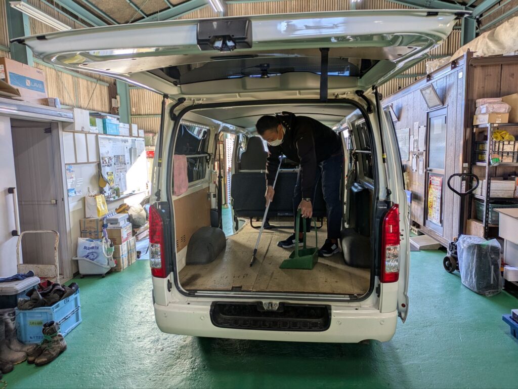次は車です。積荷を降ろしてホウキ🧹で掃除。